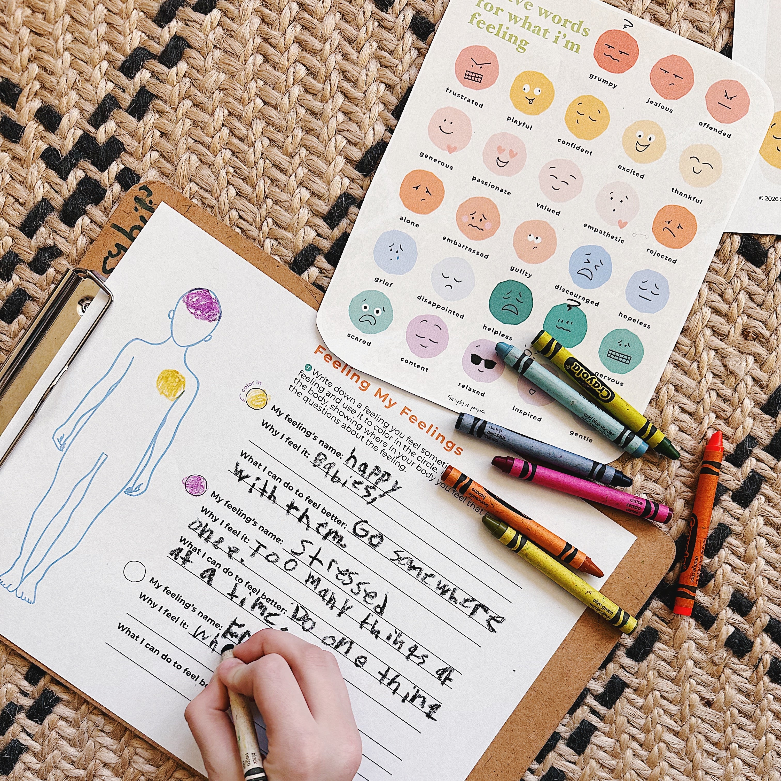 An Activity (deepens learning, more fun for everyone) an emotion/body worksheet to help you child understand where they may feel emotions in their body, name what they are feeling, and steps they can take to feel better.
