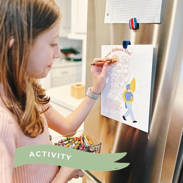 An Activity (deepens learning, more fun for everyone) a tracker with simple ideas your child can do to cheer others on.  We also included a blank tracker to color if they would like to come up wiht their own unique ways of showing up and celebrating others!