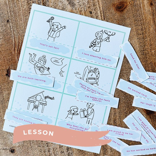 A Lesson (short and interactive) that teaches your child why it is important to cheer others on and how to retrain their brains to celebrate others.  It includes a game to choose happy thoughts to replace negative thoughts.